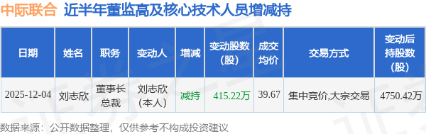 证券之星消息,根据12月5日市场公开信息、上市公司公告及交易所披露数据整理,中际联合(605305)最新董监高及相关人员股份变动情况:2025年12月4日公司董事长,总裁刘志欣共减持公司股份415.22万股,占公司总股本为1.9538%。变动期间公司股价上涨1.14%,12月4日当日收盘报41.77元。