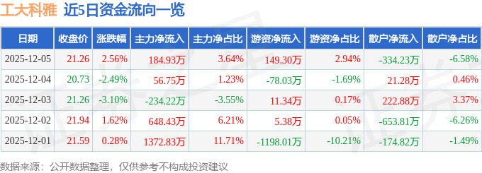 证券之星消息,截至2025年12月5日收盘,工大科雅(301197)报收于21.26元,上涨2.56%,换手率2.93%,成交量2.41万手,成交额5079.23万元。