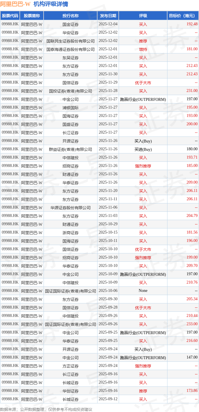 投行对该股的评级以买入为主,近90天内共有29家投行给出买入评级,近90天的目标均价为199.18港元。国金证券最新一份研报给予阿里巴巴-W买入评级,目标价192.48港元。