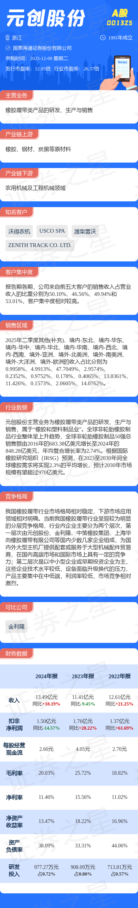 证券之星消息,元创股份12月9日网上申购,申购代码为001325,中签号公布日期为12月11日。该股概况请见下图:
