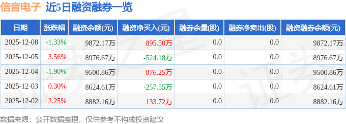 信音电子融资融券信息显示,融资方面,当日融资买入3078.38万元,融资偿还2182.88万元,融资净买入895.5万元。融券方面,融券卖出0.0股,融券偿还0.0股,融券余量0.0股,融券余额0.0万元。融资融券余额9872.17万元。