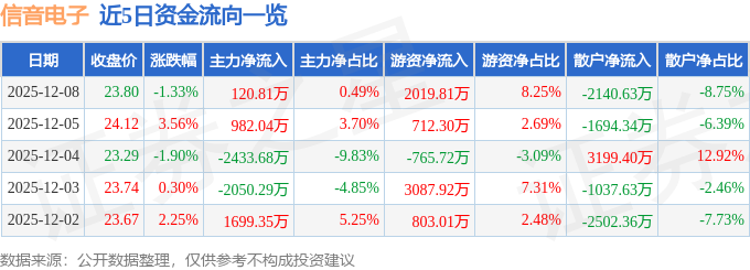 证券之星消息,截至2025年12月8日收盘,信音电子(301329)报收于23.8元,下跌1.33%,换手率17.26%,成交量10.35万手,成交额2.45亿元。