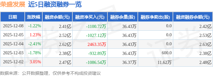 荣盛发展融资融券信息显示,融资方面,当日融资买入2296.67万元,融资偿还3397.39万元,融资净偿还1100.72万元。融券方面,融券卖出0.0股,融券偿还0.0股,融券余量36.43万股,融券余额59.02万元。融资融券余额2.42亿元。
