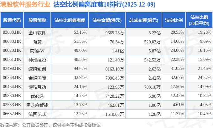 从沽空比例偏离度来看,金山软件、有赞、商汤-W沽空比例偏离度位居行业前三,分别为53.15%、51.55%、49%。