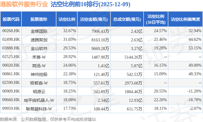 从沽空比例来看,金蝶国际、速腾聚创、金山软件沽空比例位居行业前三,分别为32.67%、31.03%、29.53%。