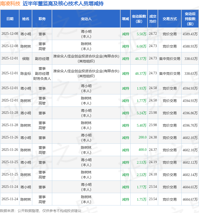 南凌科技近半年内的董监高及核心技术人员增减持详情如下: