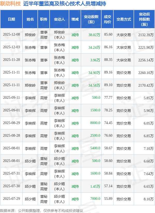 联动科技近半年内的董监高及核心技术人员增减持详情如下: