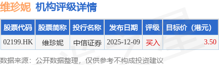 投行对该股的评级以买入为主,近90天内共有1家投行给出买入评级,近90天的目标均价为3.5港元。中信证券最新一份研报给予维珍妮买入评级,目标价3.5港元。