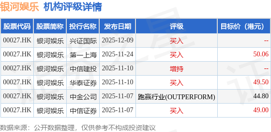 投行对该股的评级以买入为主,近90天内共有4家投行给出买入评级,近90天的目标均价为48.34港元。兴证国际最新一份研报给予银河娱乐买入评级。