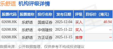 投行对该股的评级以买入为主,近90天内共有2家投行给出买入评级,近90天的目标均价为40.94港元。国盛证券最新一份研报给予乐舒适买入评级,目标价40.94港元。