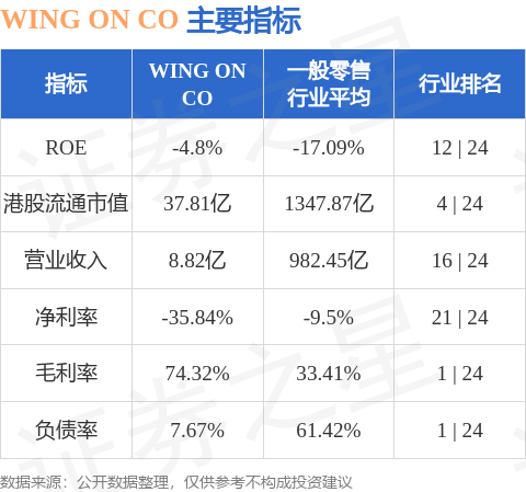 WING ON CO港股市值37.81亿港元,在一般零售行业中排名第4。主要指标见下表: