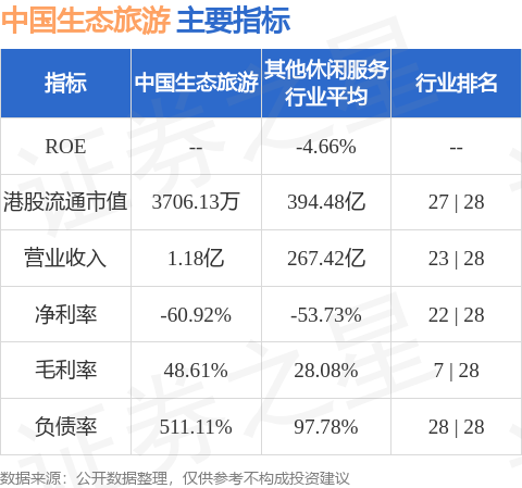 中国生态旅游港股市值3706.13万港元,在其他休闲服务行业中排名第27。主要指标见下表: