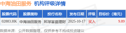 截至2025年12月10日收盘,中海油田服务(02883.HK)报收于7.19港元,下跌0.42%,成交量755.12万股,成交额5413.91万港元。投行对该股的评级以买入为主,近90天内共有1家投行给出买入评级,近90天的目标均价为9.89港元。环球富盛理财最新一份研报给予中海油田服务买入评级,目标价9.89港元。