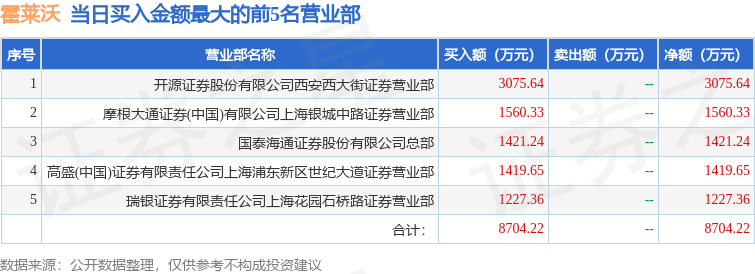 证券之星消息,沪深交易所2025年12月10日公布的交易公开信息显示,霍莱沃(688682)因有价格涨跌幅限制的日收盘价格涨幅达到15%的前五只证券登上龙虎榜。此次是近5个交易日内第1次上榜。