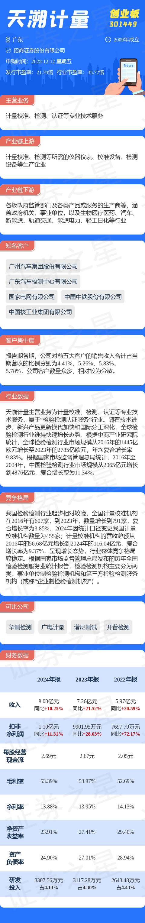 证券之星消息,天溯计量12月12日网上申购,申购代码为301449,中签号公布日期为12月16日。该股概况请见下图: