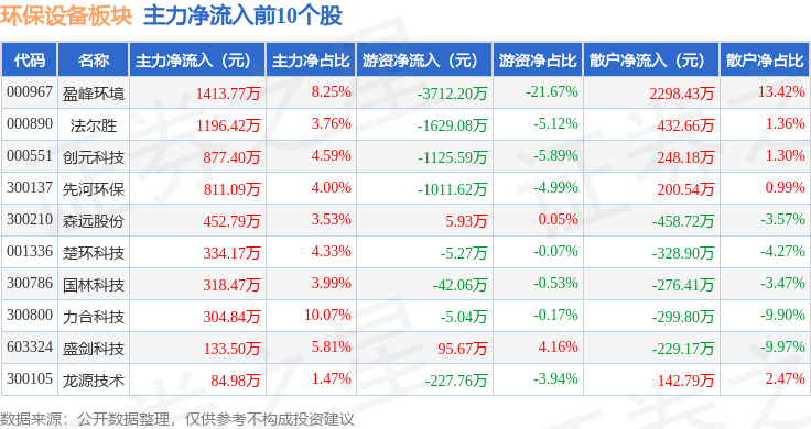 从资金流向上来看,当日环保设备板块主力资金净流出2121.81万元,游资资金净流出6501.11万元,散户资金净流入8622.92万元。环保设备板块个股资金流向见下表: