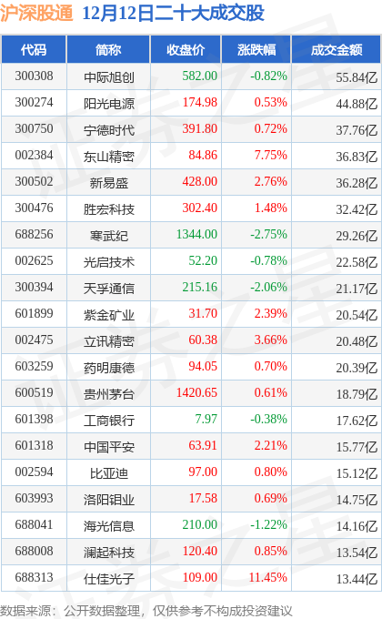当日北向资金余额额度充足,华菱线缆(001208)领涨,涨幅10.03%,交易所公布的沪深股通二十大成交股中成交额前三的为中际旭创、阳光电源、宁德时代,成交额分别为55.84亿元、44.88亿元、37.76亿元。详情可见下表: