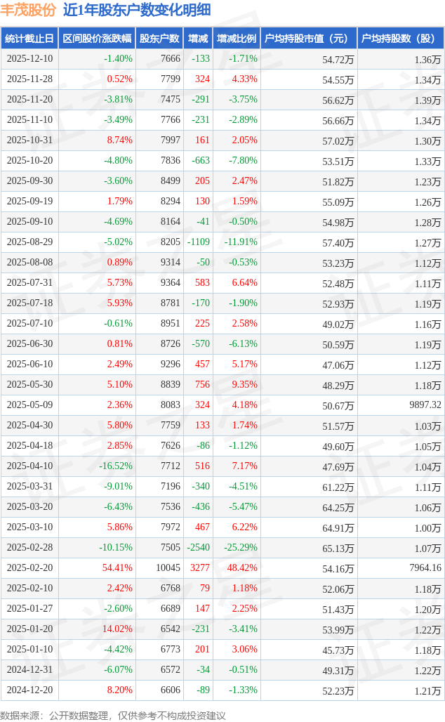 从股价来看,2025年11月28日至2025年12月10日,丰茂股份区间跌幅为1.4%,在此期间股东户数减少133.0户,减幅为1.71%。