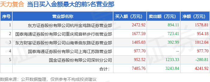 证券之星消息,沪深交易所2025年12月12日公布的交易公开信息显示,天力复合(920576)因当日收盘价涨幅达到20%的前5只股票登上龙虎榜。此次是近5个交易日内第2次上榜。