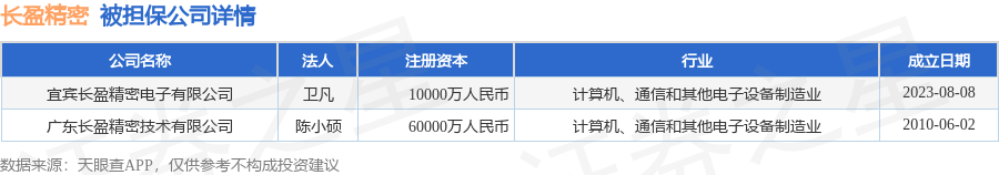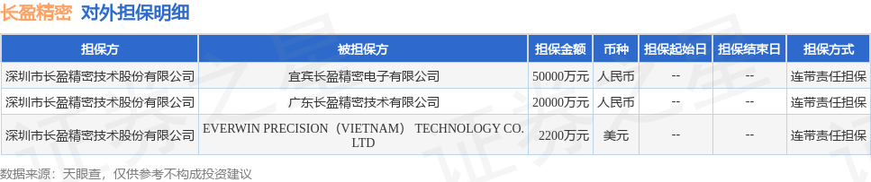 长盈精密12月10日披露3笔对外担保,被担保公司4家。对外担保明细如下表: