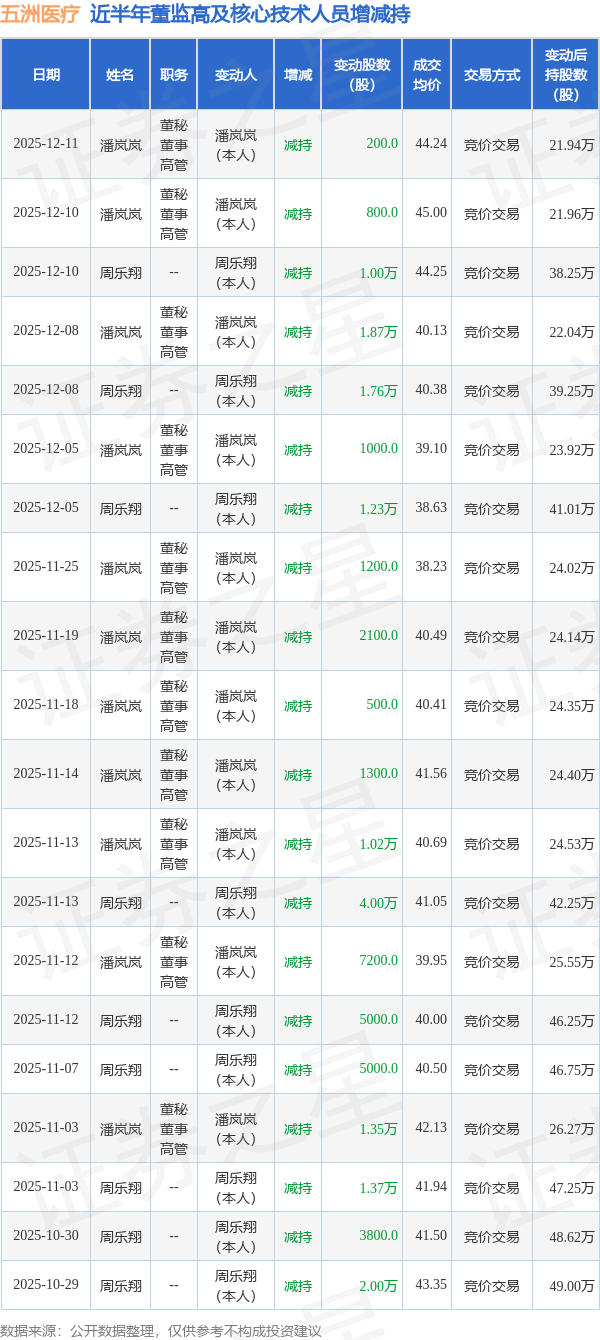 五洲医疗近半年内的董监高及核心技术人员增减持详情如下: