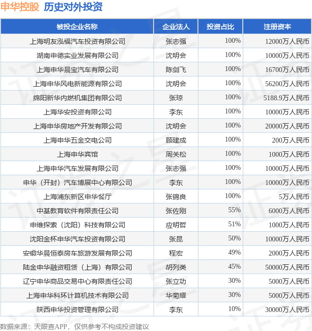 证券之星消息,根据天眼查APP显示,申华控股(600653.SH)新增一起对外投资事件,被投资公司为沈阳汽车产业投资基金合伙企业(有限合伙),法定代表人沈汽新致(沈阳)企业管理有限公司、广东省粤科母基金投资管理有限公司,投资占比为2.5%。该公司从事资本市场服务,注册资本为80000万人民币。目前,申华控股共存在对外投资24项,投资占比前20的项目见下表:
