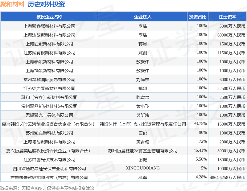 证券之星消息,根据天眼查APP显示,聚和材料(688503.SH)新增一起对外投资事件,被投资公司为上海聚鑫耀新材料有限公司,法定代表人李浩,投资占比为100%。该公司从事非金属矿物制品业,注册资本为5000万人民币。目前,聚和材料共存在对外投资18项,详见下表: