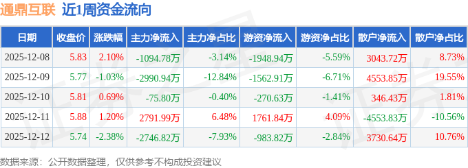 资金流向数据方面,本周通鼎互联主力资金合计净流出4116.35万元,游资资金合计净流出3004.47万元,散户资金合计净流入7120.82万元。本周资金流向一览见下表: