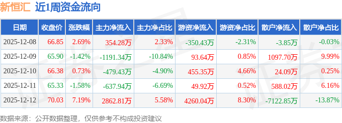 资金流向数据方面,本周新恒汇主力资金合计净流入908.37万元,游资资金合计净流入4508.52万元,散户资金合计净流出5416.88万元。本周资金流向一览见下表: