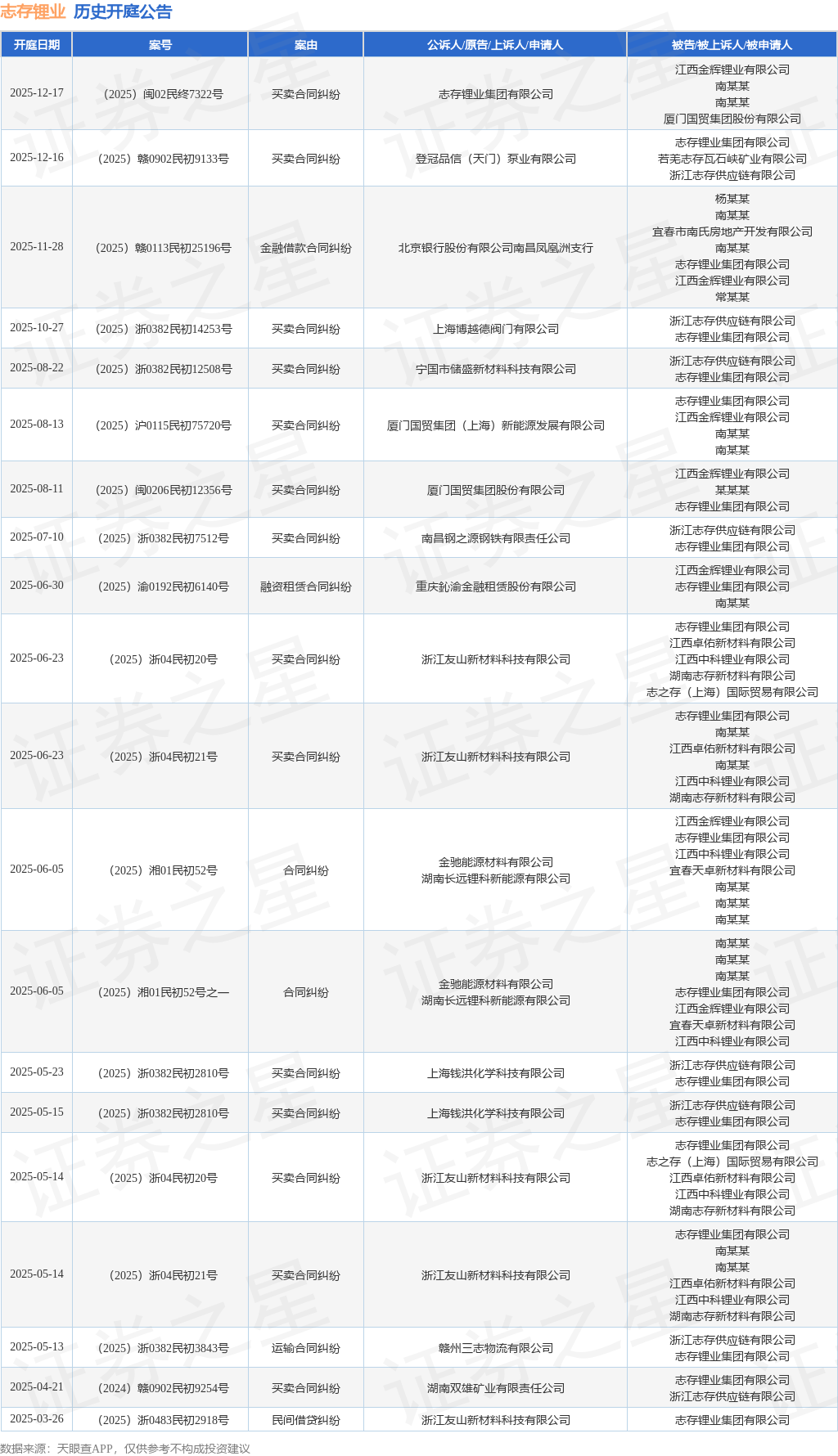 案号:(2025)闽02民终7322号根据统计,近一年内以志存锂业集团有限公司为当事人的历史开庭公告有25则,其中案由为“买卖合同纠纷”的公告以19则居首,其次为“合同纠纷”有2则,“民间借贷纠纷”有1则。历史开庭公告(前20条)如下: