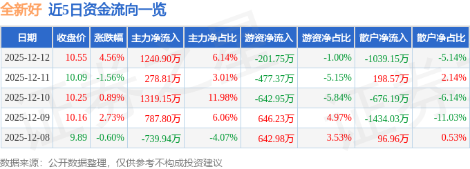 12月12日的资金流向数据方面,主力资金净流入1240.9万元,占总成交额6.14%,游资资金净流出201.75万元,占总成交额1.0%,散户资金净流出1039.15万元,占总成交额5.14%。