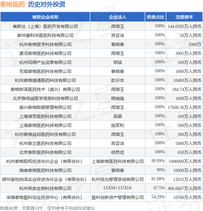 证券之星消息,根据天眼查APP显示,泰格医药(300347.SZ)新增一起对外投资事件,被投资公司为海南泰格医药科技有限公司,法定代表人曹晓春,投资占比为90%。该公司从事研究和试验发展,注册资本为10000万人民币。目前,泰格医药共存在对外投资49项,投资占比前20的项目见下表:
