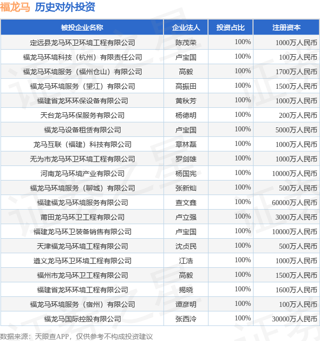 通过天眼查大数据分析,福龙马集团股份有限公司共对外投资了68家企业,参与招投标项目10481次;财产线索方面有商标信息114条,专利信息885条,著作权信息39条;此外企业还拥有行政许可166个。据2024年报数据,福龙马长期股权投资135.5万元。