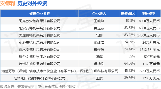 通过天眼查大数据分析,烟台北方安德利果汁股份有限公司共对外投资了8家企业,参与招投标项目8次;财产线索方面有商标信息2条,专利信息37条;此外企业还拥有行政许可20个。据2024年报数据,安德利商誉558.7万元,同比未变化。
