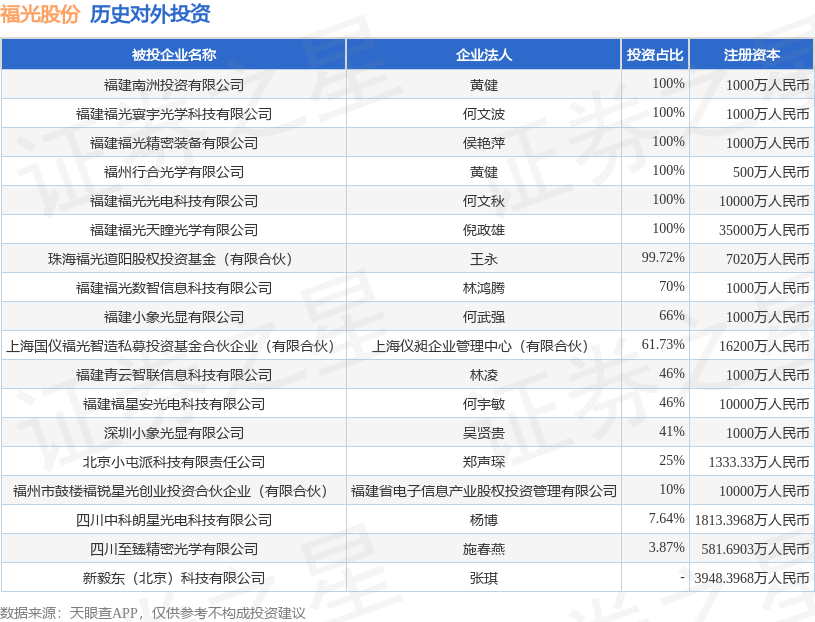 证券之星消息,根据天眼查APP显示,福光股份(688010.SH)新增一起对外投资事件,被投资公司为新毅东(北京)科技有限公司,法定代表人张琪,投资占比为-。该公司从事专用设备制造业,注册资本为3948.3968万人民币。目前,福光股份共存在对外投资18项,详见下表: