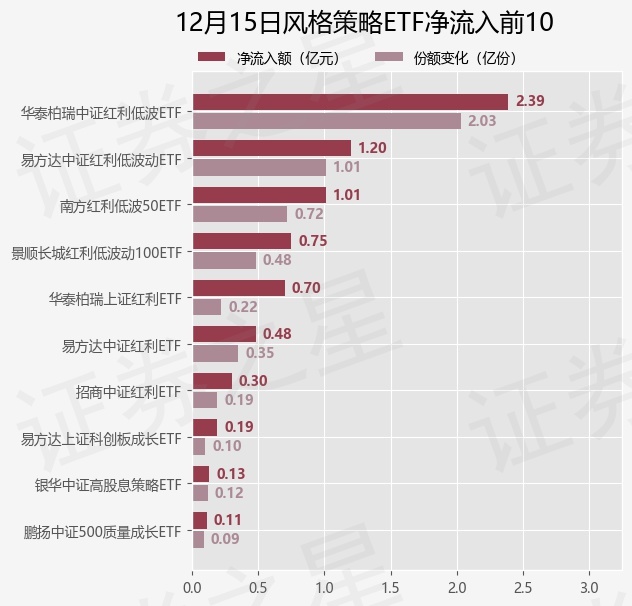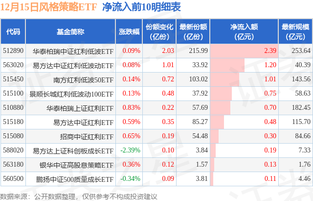 当日有17只风格策略ETF基金出现资金净流入,其中净流入排首位的是华泰柏瑞中证红利低波ETF(512890),份额增加了2.03亿份,净流入额为2.39亿元。