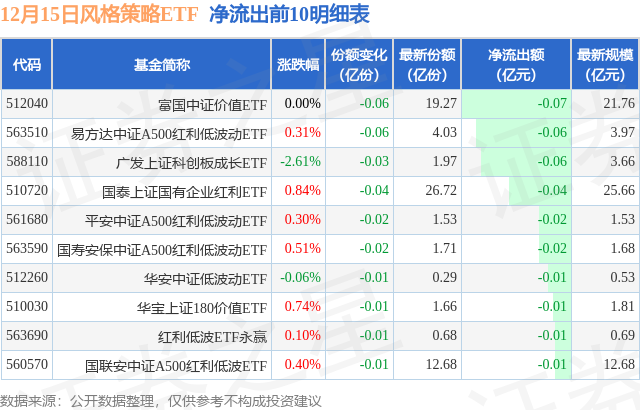 当日有11只风格策略ETF基金出现资金净流出,其中净流出排首位的是富国中证价值ETF(512040),份额减少了600.0万份,净流出额为678.31万元。