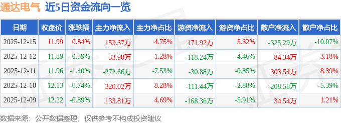 12月15日的资金流向数据方面,主力资金净流入153.37万元,占总成交额4.75%,游资资金净流入171.92万元,占总成交额5.32%,散户资金净流出325.29万元,占总成交额10.07%。