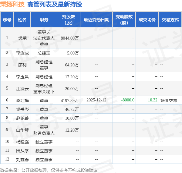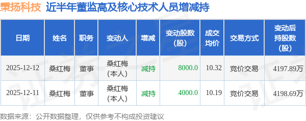 证券之星消息,根据12月16日市场公开信息、上市公司公告及交易所披露数据整理,秉扬科技(920675)最新董监高及相关人员股份变动情况:2025年12月11日至2025年12月12日公司董事桑红梅共减持公司股份1.2万股,占公司总股本为0.0069%。变动期间公司股价上涨2.93%,12月12日当日收盘报10.2元。