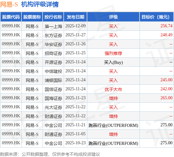 截至2025年12月16日收盘,网易-S(09999.HK)报收于211.0港元,下跌2.59%,成交量378.8万股,成交额8.03亿港元。投行对该股的评级以买入为主,近90天内共有6家投行给出买入评级,近90天的目标均价为258.18港元。第一上海最新一份研报给予网易-S买入评级,目标价256.74港元。