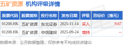 投行对该股的评级以增持为主,近90天内共有1家投行给出增持评级,近90天的目标均价为9.67港元。东北证券最新一份研报给予五矿资源买入评级,目标价9.67港元。