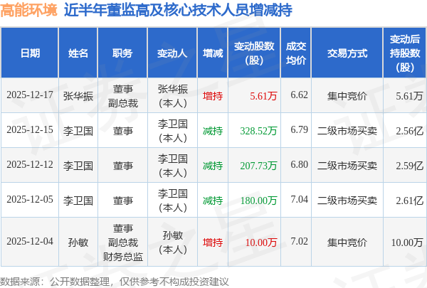 证券之星消息,根据12月17日市场公开信息、上市公司公告及交易所披露数据整理,高能环境(603588)最新董监高及相关人员股份变动情况:2025年12月17日公司董事,副总裁张华振共增持公司股份5.61万股,占公司总股本为0.0037%。变动期间公司股价上涨1.35%,12月17日当日收盘报6.78元。
