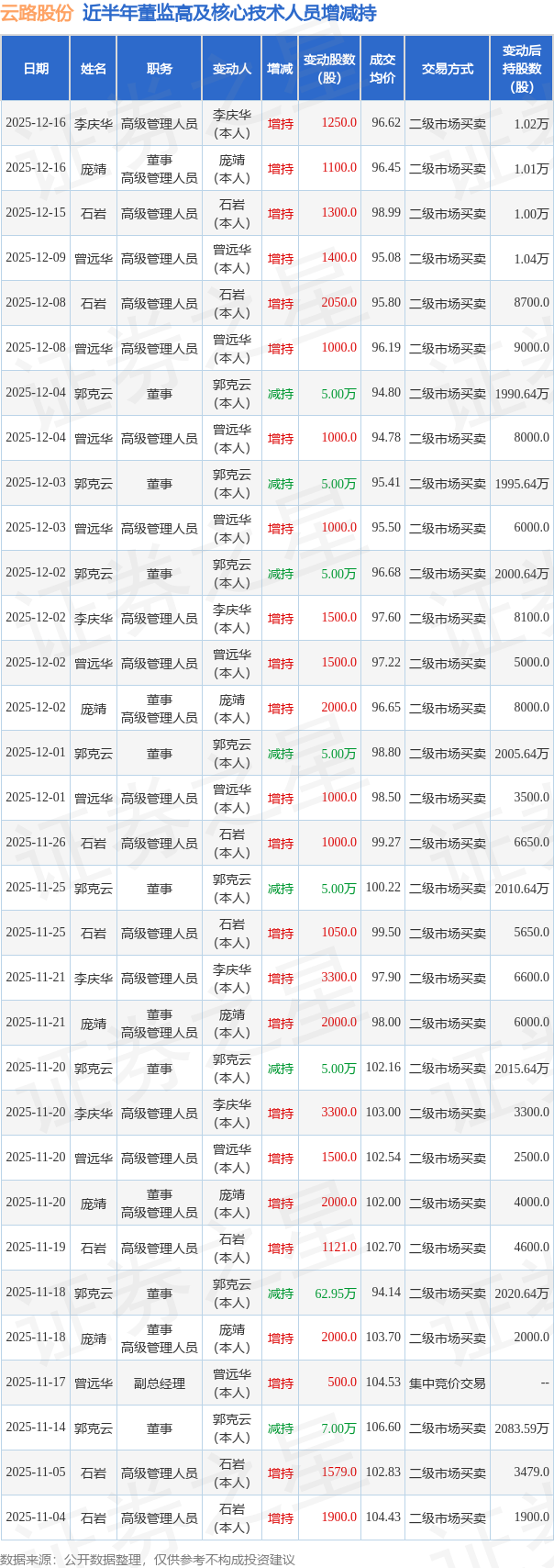 云路股份近半年内的董监高及核心技术人员增减持详情如下: