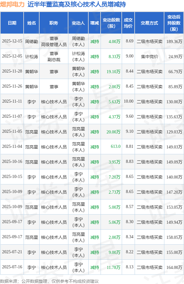 煜邦电力近半年内的董监高及核心技术人员增减持详情如下: