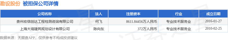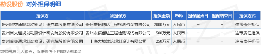 勘设股份12月16日披露3笔对外担保,被担保公司2家。对外担保明细如下表: