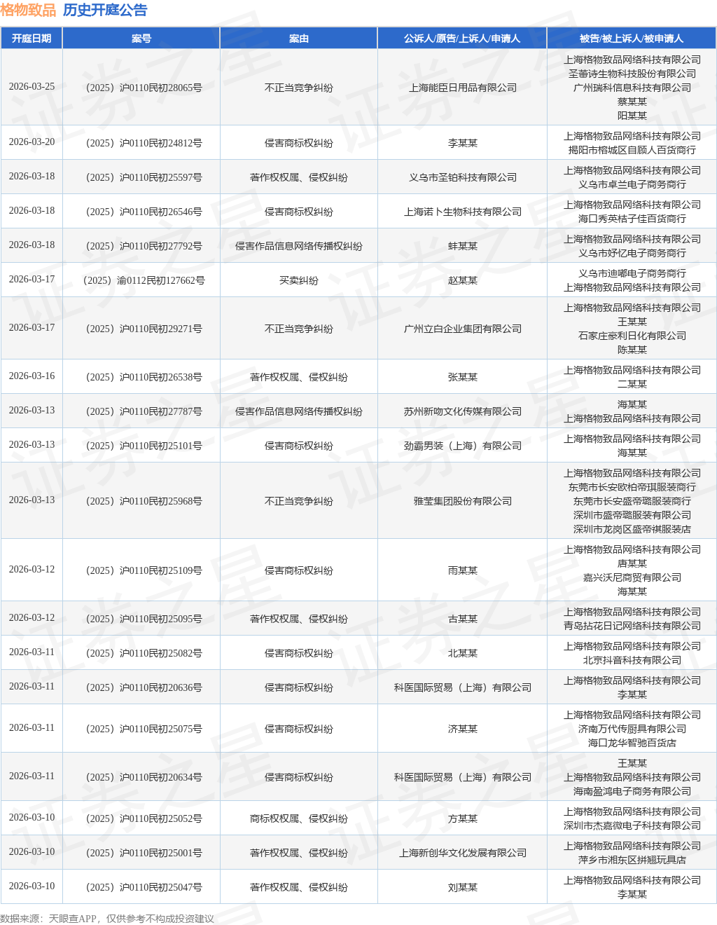 案号:(2025)沪0120民初31292号根据统计,近一年内以上海格物致品网络科技有限公司为当事人的历史开庭公告有3563则,其中案由为“侵害外观设计专利权纠纷”的公告以819则居首,其次为“侵害商标权纠纷”有713则,“著作权权属、侵权纠纷”有553则。历史开庭公告(前20条)如下: