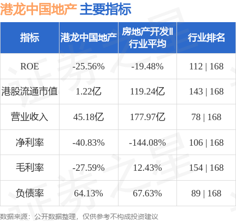 港龙中国地产港股市值1.22亿港元,在房地产开发Ⅱ行业中排名第143。主要指标见下表: