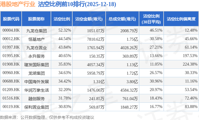 从沽空比例来看,九龙仓集团、恒基地产、九龙仓置业沽空比例位居行业前三,分别为52.32%、44.54%、43.84%。