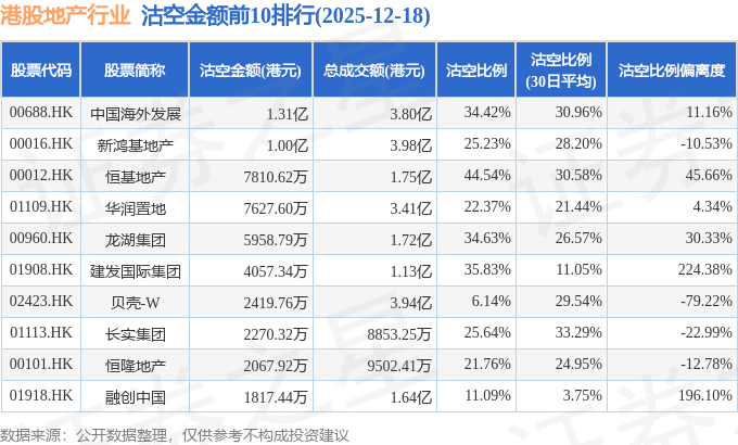 从沽空金额来看,中国海外发展、新鸿基地产、恒基地产沽空金额位居行业前三,分别为1.31亿港元、1亿港元、7810.62万港元。