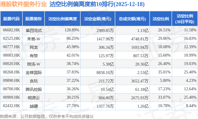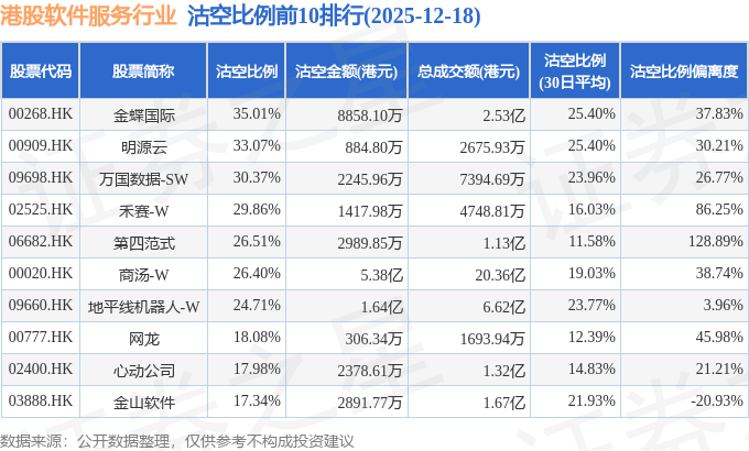 从沽空比例偏离度来看,第四范式、禾赛-W、网龙沽空比例偏离度位居行业前三,分别为128.89%、86.25%、45.98%。